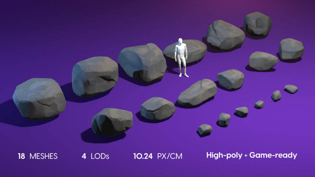 LOD information: Each rock has 4 LODs, with tri counts ranging from 2k to 200 (large rocks), 1.1k to 280 (medium rocks), and 360 to 40 (small rocks). LOD0 has a purposefully higher tri-count to support up-close cameras with no noticeable lack of visual fidelity; however, you can instead opt to use LOD1 as LOD0, resulting in each rock having 3 LODs.